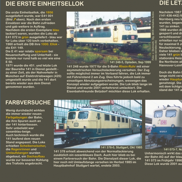 Sie fuhren täglich im Wendezugbetrieb verschlafene Pendler zur Arbeit und abends wieder zurück. Die Loks der Baureihe E 41 (ab 1968: 141) taten ihr Werk im Verborgenen. Die 141 war nie die Starlok, die glanzvoll in Erscheinung trat wie ihre Schnellzugkolleginnen. Auch wenn die E41 001 bis E41 072 bei der Auslieferung im Juni 1956 aufgrund ihrer Höchstgeschwindigkeit von 120 km/h gemäß dem Farbschema der DB zunächst blau lackiert wurden.Die E 41 war die erste Einheitslokomotive des Neubauprogramms der Deutschen Bundesbahn nach 1954 und war somit die Großmutter der DB-Neubaulokomotiven. Es folgten die E 10, E 40 und die E 50.
